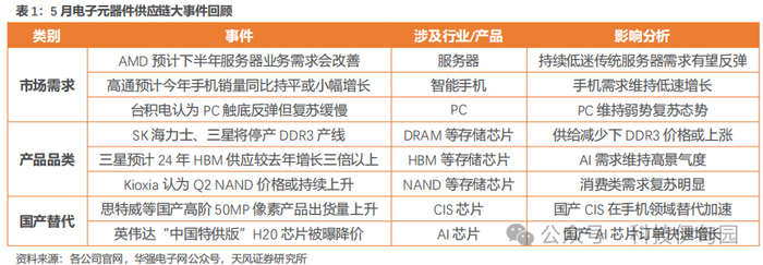 月现货大事件:5月,消费类需求维持低速增长,存储芯片量价齐升态势明显,关注SK海力士及三星停产DDR3产线对于供应链影响。