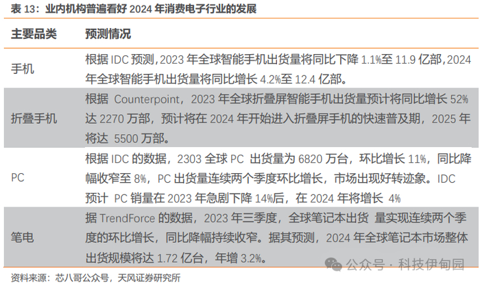 业内机构普遍看好2024年的行情。其中,在手机领域,根据IDC预测,2023年全球智能手机出货量将同比下降1.1%至11.9亿部,2024年全球智能手机出货量将同比增长4.2%至12.4亿部;在折叠手机领域,根据 Counterpoint,2023 年全球折叠屏智能手机出货量预计将同比增长52%达 2270万部,预计在2024年进入折叠屏手机的快速普及期,2025年将达5500万部;在PC领域,根据IDC的数据, 23Q3全球 PC出货量为 6820 万台,环比增长11%,出货量已经连续两个季度环比增长。据其预测,PC 销量在2023 年急剧下降 14%后,在2024年将增长4%;而在笔电领域,据 TrendForce的数据,2023 年三季度,全球笔记本出货量已经连续两个季度实现环比增长。据其预测,2024 年全球笔记本市场整体出货规模将达 1.72 亿台,年增3.2%。