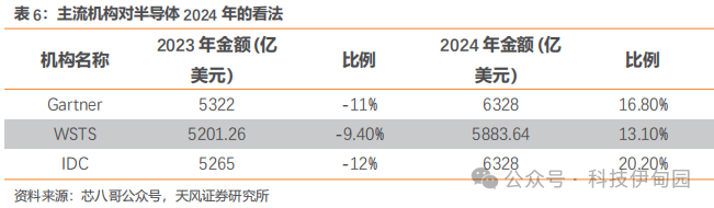 行业内多家主流机构都比较看好2024年的半导体行情。其中,WSTS表示因生成式AI普及、带动相关半导体产品需求急增,且存储需求预估将呈现大幅复苏,因此2024年全球半导体销售额将增长13.1%,金额达到5,883.64亿美元,再次创历史新高;IDC的看法比WSTS乐观,其认为2024年全球半导体销售额将达到6328亿美元,同比增长20.20%;此外,Gartner也认为2024年全球半导体销售额将迎来增长行情,增长幅度将达到16.80%,金额将达到6328亿美元。