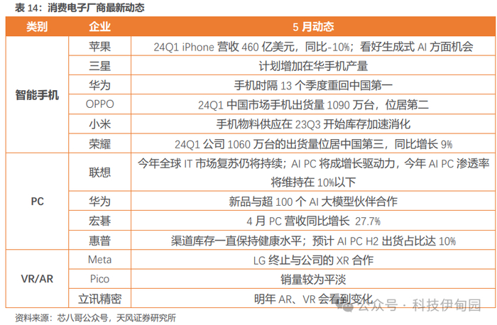 5月,中国手机市场复苏态势明显,24Q1华为手机时隔13个季度重回中国第一;AI PC销量快速增长,XR销量延续低迷。