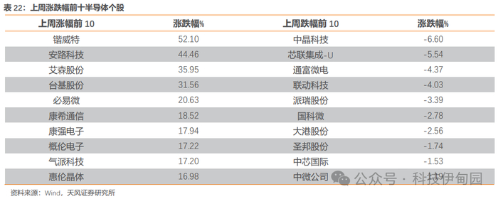上周半导体板块涨幅前10的个股为:锴威特,安路科技,艾森股份,台基股份,必易微,康希通信,康强电子,概伦电子,气派科技,惠伦晶体。