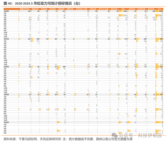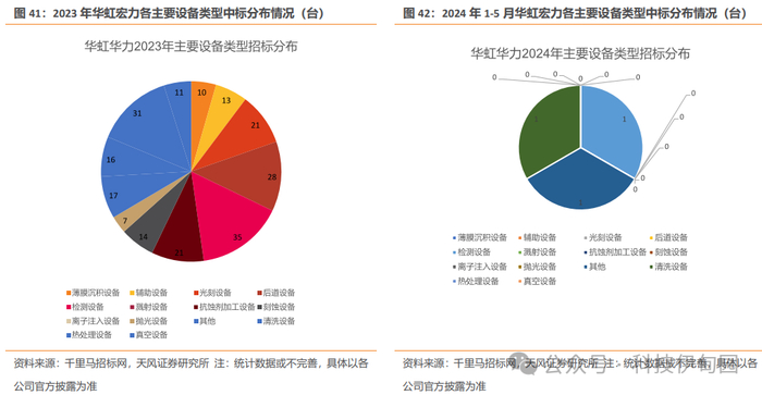 2020-2024年5月,华虹宏力可统计招标设备共3592台,包括246台薄膜沉积设备、395台辅助设备、56台光刻设备、69台后道设备、305台检测设备、2台溅射设备、34台抗蚀剂加工设备、152台刻蚀设备、33台离子注入设备、45台抛光设备、1523台其他设备、140台清洗设备、388台热处理设备、204台真空设备。