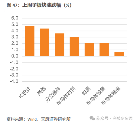 半导体各细分板块全部上涨,IC设计板块涨幅最大,半导体制造板块涨幅最小。半导体细分板块中,IC设计板块上周上涨4.7%,半导体材料板块上周上涨3.0%,分立器件板块上周上涨3.6%,半导体设备板块上周上涨2.0%,封测板块上周上涨2.1%,半导体制造板块上周上涨0.7%,其他板块上涨4.3%。