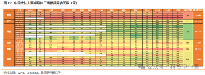 2024年第一季度,中国大陆封测、代工、IDM、设计板块公司存货周转天数同比下降,设备、材料板块公司存货周转天数同比增加。