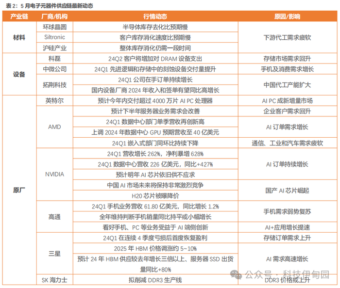 5月,设备行业温和回升,硅晶圆需求仍低迷并持续去库存。