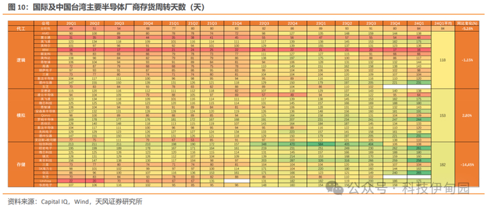 2024年第一季度,国际及中国台湾代工、模拟、存储板块公司存货周转天数同比下降,分别为-5.16%,-1.15%,-14.45%。逻辑板块公司存货周转天数同比小幅上升,为+2.80%。