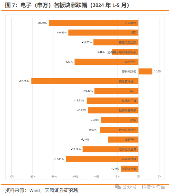 2024年1-5月,申万指数各电子细分板块大部分出现较大幅度下跌。涨幅最高(跌幅最小)的三名分别为印刷电路板(3.26%)、半导体设备(-4.19%)和消费电子零部件及组装(-6.18%)。跌幅居前三名分别为模拟芯片设计(-25.32%)、分立器件(-21.19%)和半导体材料(-17.11%)。