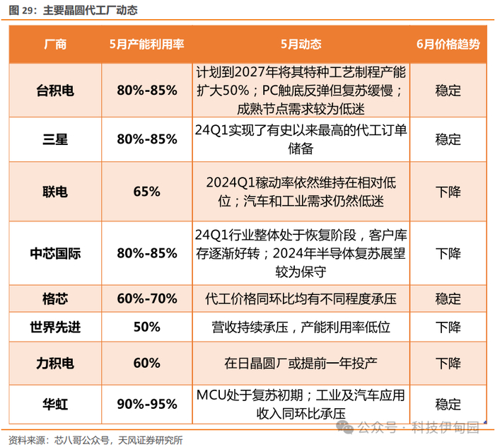 5月,先进制程订单持续增长,成熟制程产能利用率低迷,终端需求整体处于恢复阶段。
