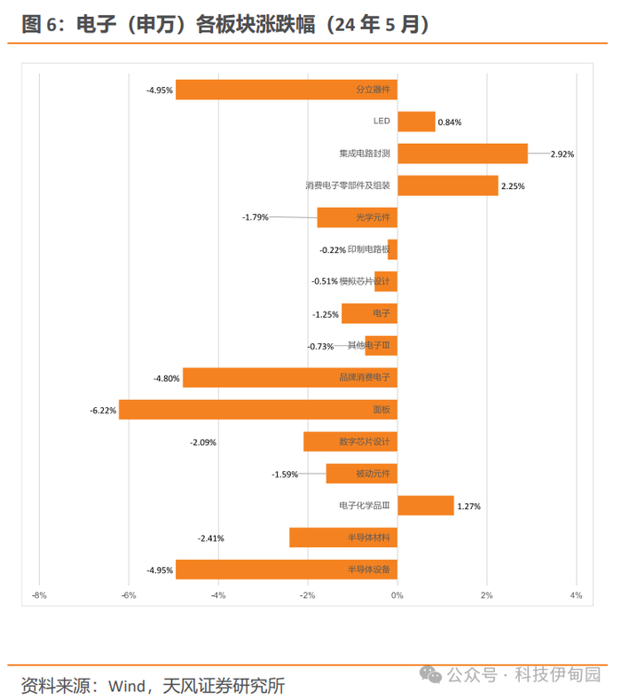 半导体细分板块:2024年5月,申万指数各电子细分板块大部分出现下跌。涨幅居前三名分别为集成电路封测(2.92% )、消费电子零部件及组装(2.25% )和电子化学品Ⅲ(1.27%)。跌幅居前三名分别为面板(-6.22%)、分立器件(-4.95%)和半导体设备(-4.95%)。