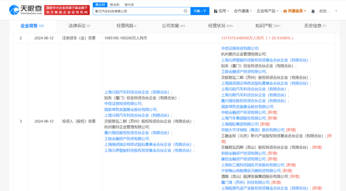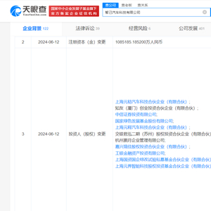 天眼查显示,6月12日,智己汽车科技有限公司(以下简称智己汽车)发生工商变更,新增股东直接或间接涉及宁德时代、上汽集团、中国银行、中国太保等上市公司。