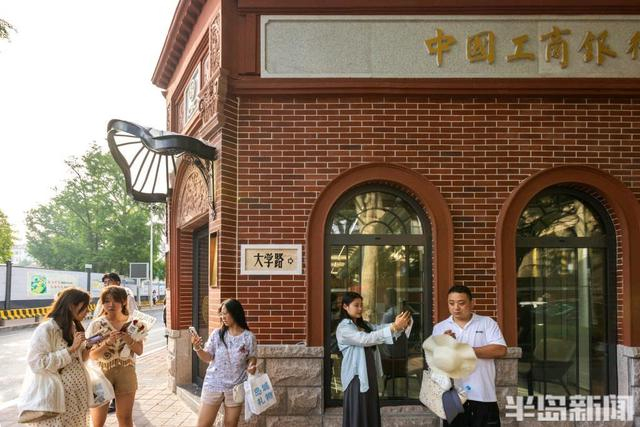 位于大学路与龙口路交界处坐落着中国工商银行青岛龙口路支行。该银行位于大学路网红街区,原本平平无奇。记者从一位银行工作人员处了解到,前期银行外立面进行了重新施工,如今以崭新的面貌亮相老城区街头。新银行外观既有怀旧味道,又有精致感觉,与周边红瓦绿树的老城风貌和谐相融。