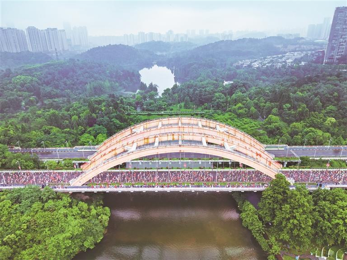 参赛选手通过横跨观山湖公园的彩虹桥。
