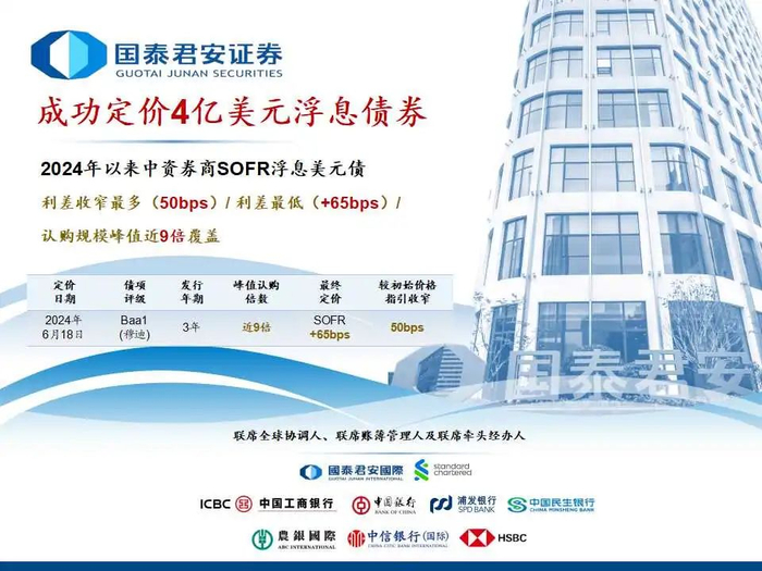 6月18日,国泰君安在国际资本市场成功定价发行3年期4亿美元境外高级无抵押浮息债券,发行结构为国泰君安证券担保发行,发行票息为SOFR+65bps,债券评级为穆迪Baa1,国泰君安国际为项目的牵头全球协调人、联席账簿管理人和联席牵头经办人。