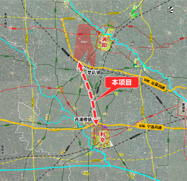 项目线路起自涡阳县楚店镇西侧接在建亳蒙高速,而后向南在纪王场乡与江集镇之间穿越,避让风力发电机组,后与S310交叉设置江集互通,继续向东南上跨青阜铁路,在既有利辛互通西侧接G36宁洛高速,全长约28公里。