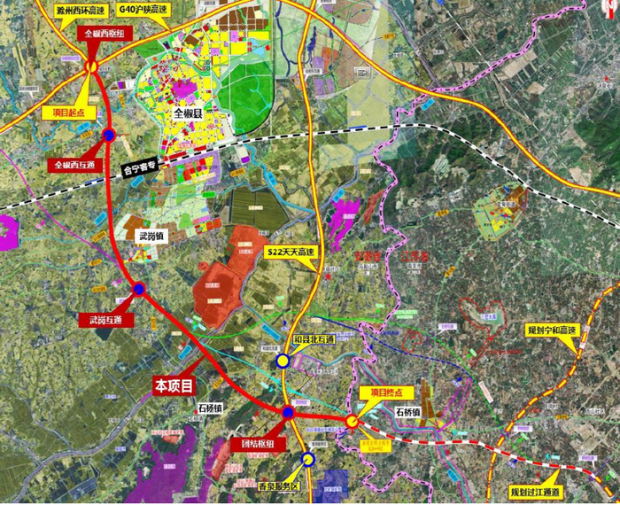 项目路线起于G40沪陕高速与S98滁州支线高速交叉处,向南跨越襄河、S326、合宁客专,在武岗镇北侧与S210交叉后,路线折向东,经过椒陵新城,跨越荒草三圩和滁河,在绰庙社区北侧与天天高速交叉,在石杨镇大武村附近终于皖苏省界,顺接禄口至全椒高速江苏段,线路总长约22.3公里。