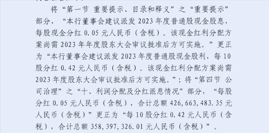 据珠海华润银行2023年年度报告更正公告,根据审慎资本补充意见,经董事会审议通过,将年报中披露的”董事会建议派发2023年度普通股现金股息,每股现金分红0.05元人民币“更正为”董事会建议派发2023年度普通股现金股利,每10股分红0.42元人民币“,同时将“每股分红0.05元人民币,合计总额元人民币”更正为“每10股分红0.42元人民币,合计总额358,397,326.01元人民币”。
