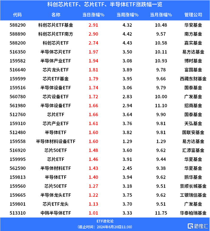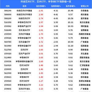 ETF方面,华安基金科创芯片ETF基金、南方基金科创芯片ETF南方、嘉实基金科创芯片ETF涨超2.7%;易方达基金半导体芯片ETF、博时基金半导体产业ETF、富国基金芯片龙头ETF、西藏东财基金芯片ETF基金、国泰基金半导体设备ETF、广发基金芯片设备ETF、国泰基金芯片ETF、招商基金半导体设备ETF、天弘基金芯片产业ETF、国联安基金半导体ETF、易方达基金半导体材料设备ETF涨超1.6%。
