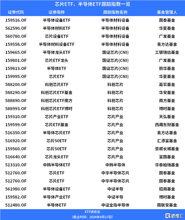 6月以来,华泰柏瑞基金中韩半导体ETF、招商基金半导体设备ETF、博时基金半导体产业ETF、嘉实基金科创芯片ETF、华安基金科创芯片ETF基金、易方达基金半导体芯片ETF、广发基金芯片设备ETF涨超10%。