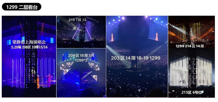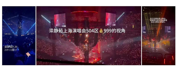 潇湘晨报从现场图片和视频资料中看到,当天演唱会的现场舞台设置的是“四面台”,舞台处于场馆正中间,四周可以坐满观众。有资料介绍,相比“三面台”,“四面台”一方面可以增加观众席容量,另一方面方便每个角度的观众“无死角”观看演出,但是在梁静茹上海演唱会这场,四周架起了“大柱子”,造成不少观众的视野被遮挡。