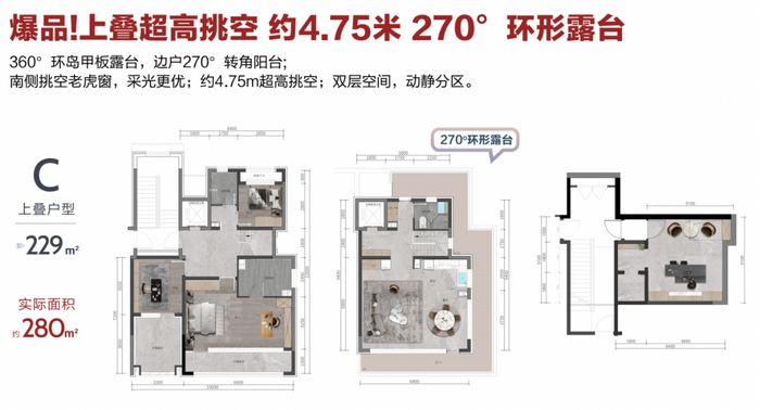 下叠户户带绿地,南向有约53㎡的台地式绿地观景;上叠则有超高挑空,最高点达4.75m,同时拥有270°超大开敞环形露台。