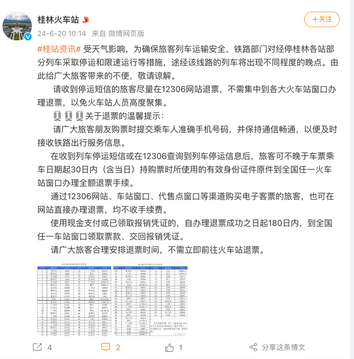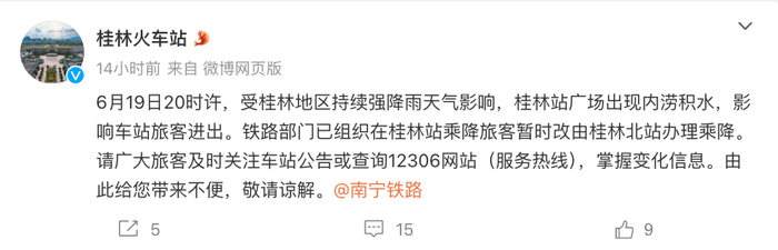 6月20日上午,@桂林火车站发布消息称,受天气影响,为确保旅客列车运输安全,铁路部门对经停桂林各站部分列车采取停运和限速运行等措施,途经该线路的列车将出现不同程度的晚点。请收到停运短信的旅客尽量在12306网站退票,不需集中到各大火车站窗口办理退票,以免火车站人员高度聚集。