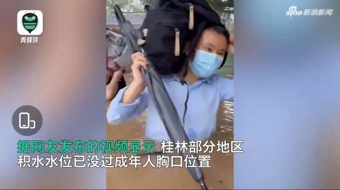 据青蜂侠,桂林城区出现洪水倒灌,部分地区积水水位已没过成年人胸口位置。当地居民将随身物品举过头顶,在深水中缓步前行。