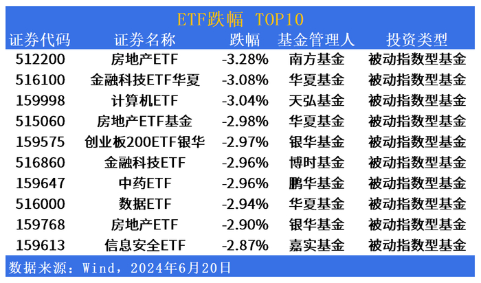 2024年6月20日,Wind数据显示,上证指数收跌0.42%,创业板指跌1.44%。汽车服务、房地产服务跌幅居前;半导体概念活跃,教育板块逆市走强。