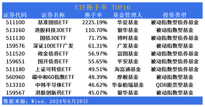 换手率榜单中,基准国债ETF(511100)换手率达2225.19%,远超市场其他产品。港股科技30ETF(513160)换手率居股票类ETF首位。QDII基金中韩半导体ETF(513310)换手率超40%。