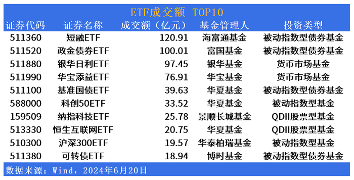 具体来看,短融ETF(511360)、政金债券ETF(511520)成交额均破百亿元。科创50ETF(588000)成交额居股票类ETF首位,纳指科技ETF(159509)成交额仍居市场前列。
