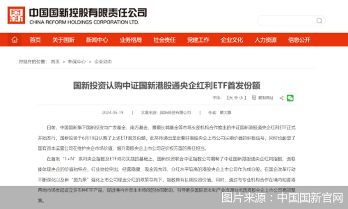 6月19日,据中国国新控股有限责任公司(以下简称“中国国新”)官网信息,日前,中国国新旗下国新投资有限公司(以下简称“国新投资”)与广发基金、南方基金、景顺长城基金等市场头部机构合作推出的中证国新港股通央企红利ETF正式开始发行。