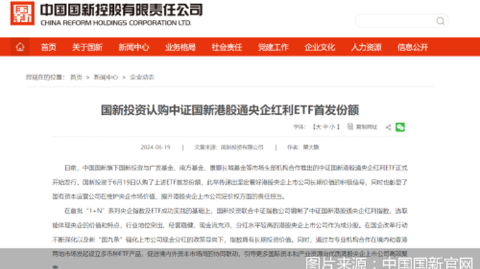 6月19日,据中国国新控股有限责任公司(以下简称“中国国新”)官网信息,日前,中国国新旗下国新投资有限公司(以下简称“国新投资”)与广发基金、南方基金、景顺长城基金等市场头部机构合作推出的中证国新港股通央企红利ETF正式开始发行。
