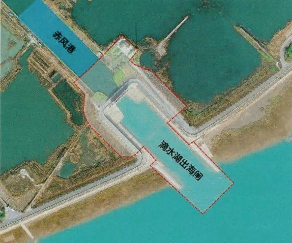 滴水湖出海闸的内河为赤风港,外河为杭州湾,距离滴水湖直线距离约2千米,是连接滴水湖与东海的重要通道。由中国船舶工业第九设计研究院设计,2004年6月动工兴建,2005年7月竣工,为三孔节制闸,总宽30米,设计流量270立方米/秒,主要承担着港城挡潮、排涝和置换水体功能。2023年,滴水湖出海闸共排水70闸次,224.67小时,3841.81万方,引水6闸次,10.42小时 ,178.13万方,保障了滴水湖区域的防汛安全与稳定水质。