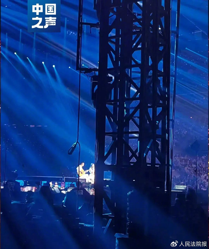 • 原先的舞台设计并无承重柱,演出前制作方为了提升演出效果,临时增加了舞台角柱作为承重,属于常规舞台设计。