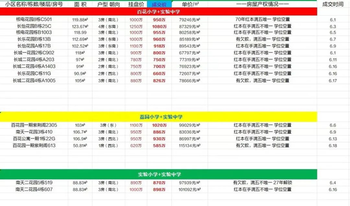百花片区二手房6月成交一览(部分)。受访者提供