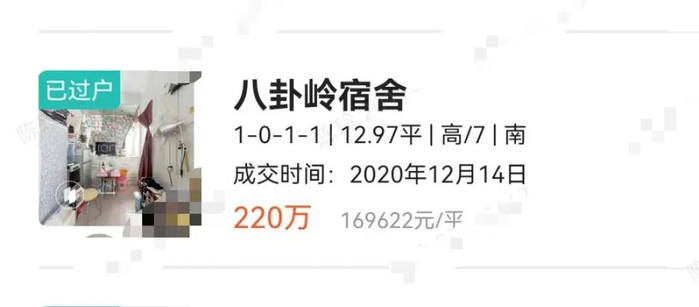6月20日,记者从某中介机构的交易平台检索发现,5月31日,八卦岭宿舍最新成交了一套面积为19.25平方米的单间,成交总价不到100万元,单价在50286元/平方米。而5月25日成交的一套25.65平方米的单间,成交单价已经跌至39376元/平方米。