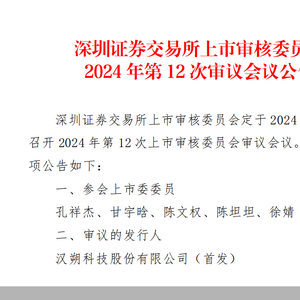 根据安排,深交所上市审核委员会定于2024年6月21日召开2024年第12次上市审核委员会审议会议,审议汉朔科技的首发申请。