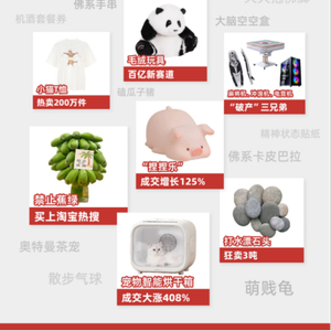 还有一大波奇奇怪怪的商品,被买上了淘宝热搜,从小众隐藏款变成年轻人的时髦单品。比如“大脑空空盒”、“天天抱佛脚”、 “精神状态贴纸”主打解压;“磕瓜子猪”、“万物可取手”主打毫不费力,可可爱爱的“散步气球”、“无边宠物抱枕”、“佛系卡皮巴拉”更是情绪价值拉满。