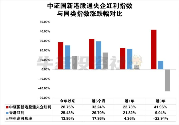 相较于同类型指数,中证国新港股通央企红利指数的业绩表现在长中短期均有一定优势,其近三年涨幅为41.96%,超越其他同类型指数30个百分点。