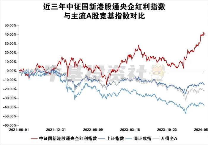 与主流宽基指数相比,中证国新港股通央企红利指数近三年涨幅超越主流A股宽基指数,在市场震荡期间表现出一定的防御属性。