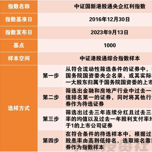 中证国新港股通央企红利指数从港股通范围内选取国务院国资委央企名录中分红水平稳定且股息率较高的上市公司证券作为指数样本,以反映港股通范围内股息率较高的央企上市公司证券的整体表现。