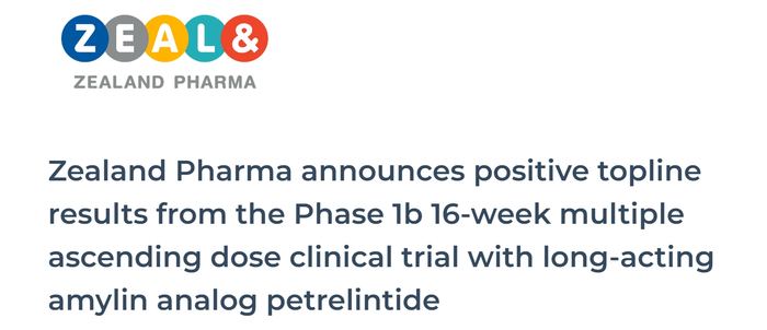 当地时间周四,丹麦生物技术公司Zealand制药发布公告称,公司在研的长效胰淀素(amylin)类似物petrelintide在Ⅰb期试验中取得积极的顶线结果。