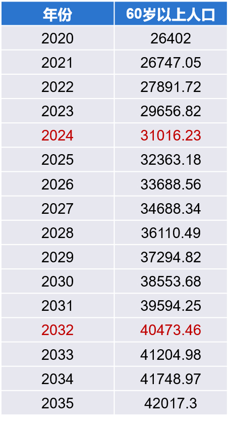 从1962年我国婴儿潮算起,60年后的他们正好步入老年。上海交通大学安泰经济与管理学院特聘教授、养老行业研究团队首席专家罗守贵预计,到2035年之前,平均每年将有2241万人口新入老年队列,剔除60岁以上所有年龄的死亡人口后,平均每年净增老年人口1091万,这意味着中国老龄化的加速期真正到来。预计2026年中国60岁以上人口就将超过美国全国人口,接近3.37亿;2032年将超过4亿;2035年达4.2亿;2050年将达5亿左右。