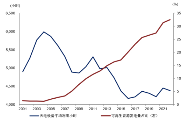 辅助服务费用、容量电价给予火电合理回报,推动煤电向保供调节电源转型。新能源大规模并网后,煤电逐渐向保供兜底与调节电源过渡,发电空间不断受压缩,单一电量电价收入难以体现火电企业长期合理回报和现金流。首先,煤电企业单位发电量的固定成本上升,当可再生能源发电量超过15%后,火电利用小时数快速下降,仅靠电量电费收入难以弥补固定成本;其次,可变成本在规模不经济下亦上升,同时受煤价波动影响较大,利润不稳定、与煤价负相关带来经营压力[26]。煤电容量电价改革有助于加强火电企业的合理盈利、弱化盈利周期性。