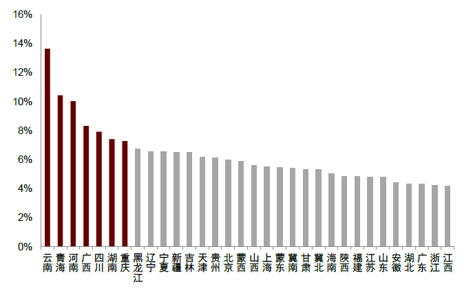 注:红色柱子为容量电价165元/千瓦·年的省份,灰色柱子为容量电价100元/千瓦·年的省份,我们采用2022年各省火力发电小时数和燃煤标杆电价来测算各省的火力发电总收入,并根据各省公布的容量电价来测算占比