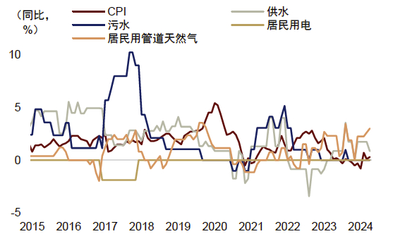 公用事业价格改革渐次展开。2024年3月《关于2023年国民经济和社会发展计划执行情况与2024年国民经济和社会发展计划草案的报告》[2]中提出将“加快推进能源价格改革,落实煤电容量电价机制,完善成品油管道运输价格形成机制,有序推进水电气热等公用事业和公共服务价格改革。”2024年1月开始煤电容量电价机制改革落实,2024年3月上海两区[3]调整供水价格,2024年5月广州中心城区召开供水价格改革听证会[4],今年来多地政府进一步实施居民天然气价格的顺价政策。