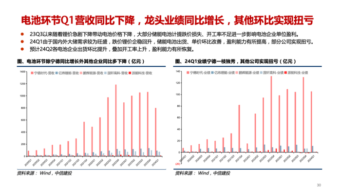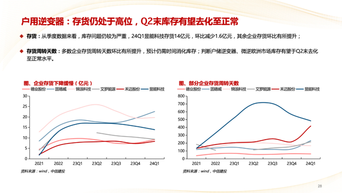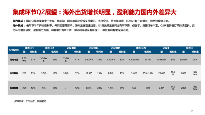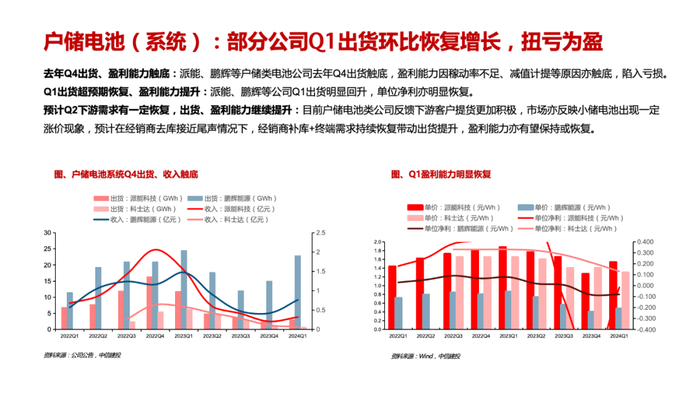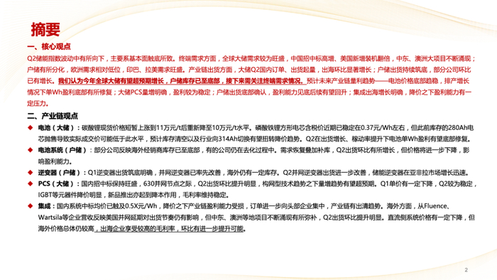 电池系统(户储):部分公司反映海外经销商库存已至底部,有的公司仍在去化过程中。需求恢复叠加补库,Q2出货环比有所增长,但价格将进一步下降,影响盈利能力。