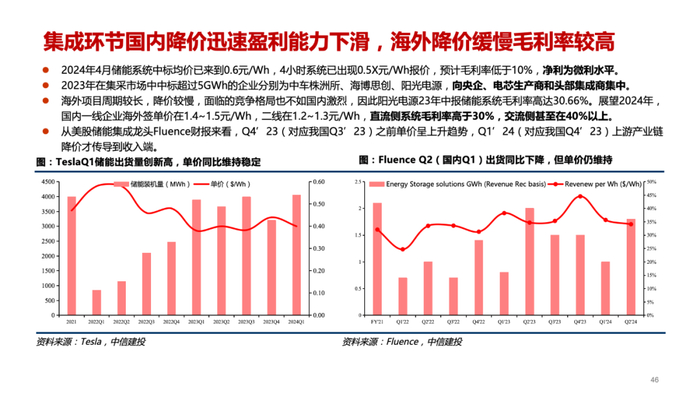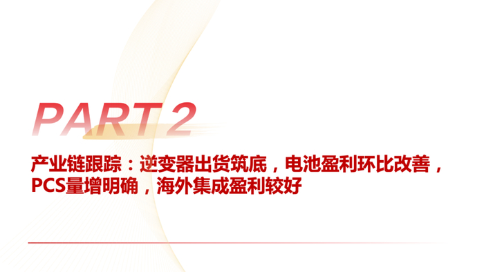 集成:国内系统中标均价已触及0.5X元/Wh,降价之下产业链盈利能力受损,订单进一步向头部企业集中,产业链有出清趋势。海外方面,从Fluence、Wartsila等企业营收反映美国并网延期对出货节奏仍有影响,但中东、澳洲等地项目不断涌现有所弥补,Q2出货环比提升明显。直流侧系统价格有一定下降,但海外价格总体仍较高,出海企业享受较高的毛利率,环比有进一步提升可能。