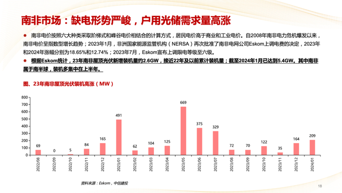 南非屋顶光伏:23年南非屋顶光伏新增装机2.6GW,接近22年及以前累计装机量;2024年1月新增装机204MW,电力危机下光储需求高增。
