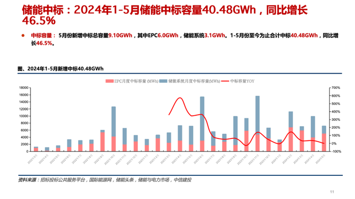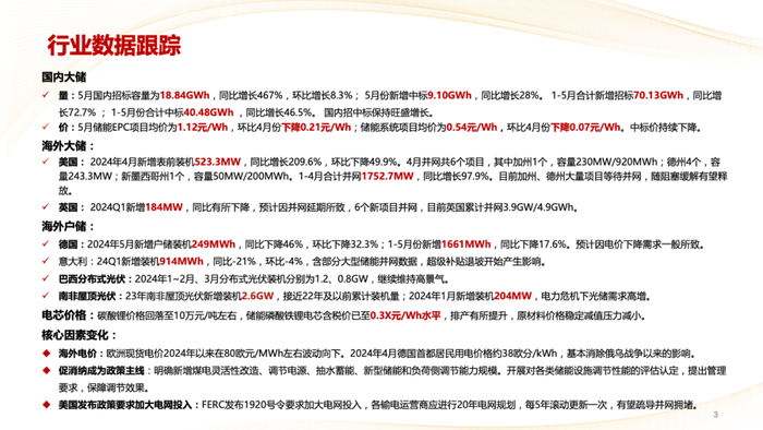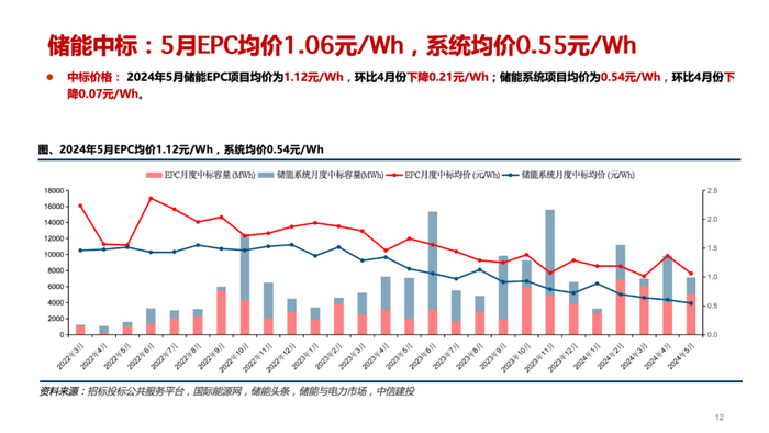 价:5月储能EPC项目均价为1.12元/Wh,环比4月份下降0.21元/Wh;储能系统项目均价为0.54元/Wh,环比4月份下降0.07元/Wh。中标价持续下降。