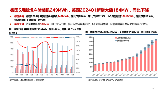德国:2024年5月新增户储装机249MWh,同比下降46%,环比下降32.3%;1-5月份新增1661MWh,同比下降17.6%。预计因电价下降需求一般所致。